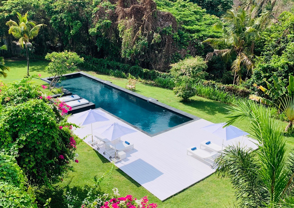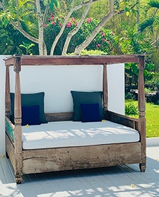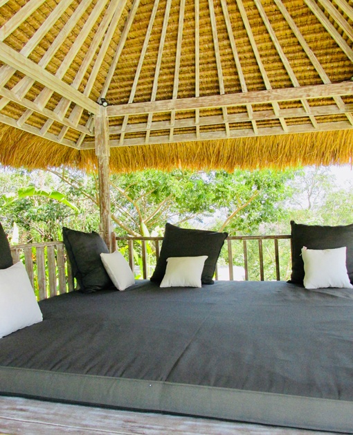 In the heat of the afternoon, a white bleached gazebo shaded by an alang – alang roof is the perfect place to rest near the main pool. Many Balinese wooden antique benches with soft cushions and mattresses, are strategically scattered in the villas and the gardens. A Javanese four-poster bed invites you to meditate (or take a nap) under the shade of a fragrant frangipani.